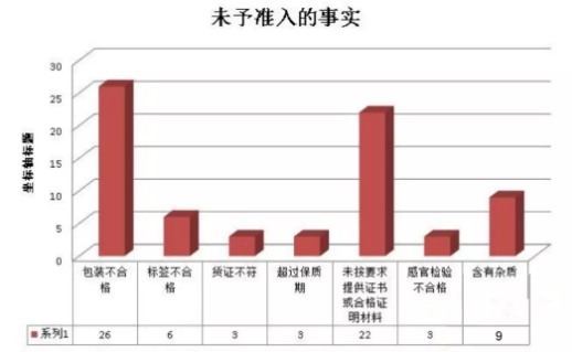 從名單中不難發(fā)現(xiàn),產(chǎn)品未予準(zhǔn)入的事實(shí)為:包裝不合格、標(biāo)簽不合格、貨證不符、超過保質(zhì)期、未按要求提供證書或合格證明材料、感官檢驗(yàn)不合格、含有雜質(zhì)等。但值得注意的是,包裝不合格以及未按要求提供證書或合格證明材料兩大問題較為突出,分別達(dá)到了26及22批次。