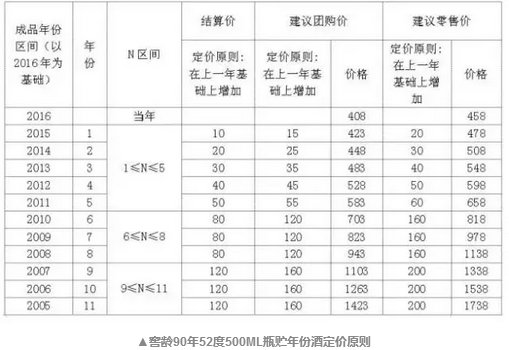1、窖齡90年52度成品酒實施年份化定價,結算價、建議團購價、建議零售價定價原則均在上一年基礎上增加。以2016年為基礎,建議團購價408元/瓶,建議零售價458元瓶;