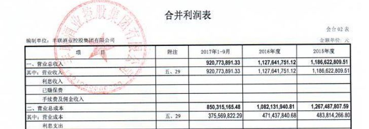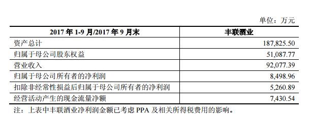 當(dāng)天,老白干還發(fā)布了《豐聯(lián)酒業(yè)控股集團有限公司審計報告》,報告指出2017年1-9月份,豐聯(lián)酒業(yè)實現(xiàn)營業(yè)收入9.2億元,歸屬于母公司股東的凈利潤為8498.96萬元。而2016 年豐聯(lián)酒業(yè)收入為 11.2 億元,按照白酒年底是銷售旺季的市場規(guī)律,2017年豐聯(lián)酒業(yè)業(yè)績已經(jīng)開始好轉(zhuǎn)。