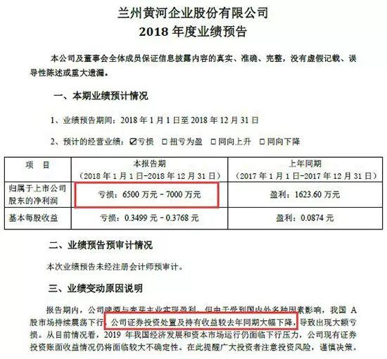 蘭州黃河2018年因炒股預(yù)虧6500萬(wàn)元-7000萬(wàn)(資料來(lái)源:業(yè)績(jī)預(yù)告)