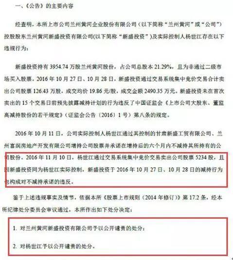 蘭州黃河董事長(zhǎng)楊世江違規(guī)減持遭公開(kāi)譴責(zé)(資料來(lái)源:深交所)
