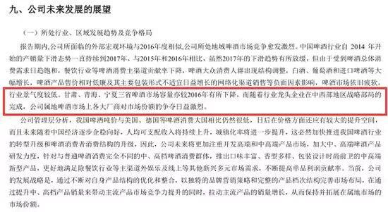 蘭州黃河在2017年年報(bào)中坦承:“甘肅、青海、寧夏三省啤酒市場(chǎng)容量下降,隨著行業(yè)龍頭企業(yè)在中西部地區(qū)戰(zhàn)略布局的完成,公司屬地啤酒市場(chǎng)上各大廠商對(duì)市場(chǎng)份額的爭(zhēng)奪日益激烈。