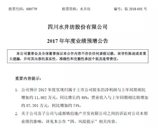 1月25日,水井坊(600779.SH)在上交所披露了2017年年度業(yè)績預(yù)增公告,經(jīng)財務(wù)部門初步測算,水井坊預(yù)計2017年度實現(xiàn)歸屬于上市公司股東的凈利潤與上年同期相比增加約1.1億元,同比增長約49%;營業(yè)收入與上年同期相比將增加約8.7億元,同比增加約74%。
