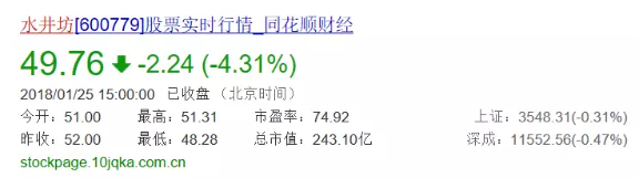 截止2018年1月25日收盤,水井坊收于49.76元/股,跌幅約為4.31%,至此,水井坊股價回調(diào)至50元/股以內(nèi)。