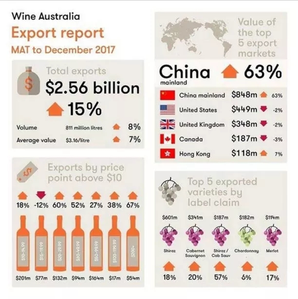 1月23日,澳大利亞葡萄酒管理局(Wine Australia) 發布了最新的出口報告,報告指出,2017年,中國進口澳洲葡萄酒的總額為8.48億澳元(折合人民幣約43億元),同比增長63%,中國進口澳洲葡萄酒的總量為1.53億升,同比增長54%,澳大利亞葡萄酒管理局執行總裁Andreas Clark表示,中國是澳大利亞葡萄酒銷售量增長的“發動引擎”。