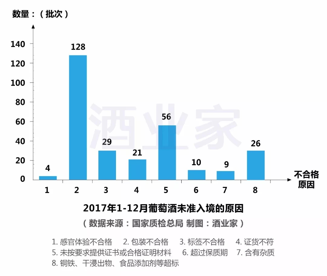 包裝不合格是進口葡萄酒的“重災(zāi)區(qū)”,2017年共有128批次進口葡萄酒因包裝不合格被銷毀或退貨,占比高達45.2%。其次,未按要求提供證書或合格證明材料有56批次,標簽不合格有29批次,證貨不符21批次,超過保質(zhì)期10批次,主要為保質(zhì)期較短的起泡酒,因質(zhì)量問題而退貨銷毀的進口葡萄酒共26個批次。