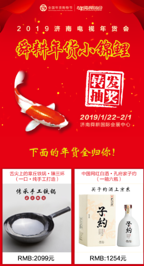 2019年2月1日,前后歷時18天的2019全國年貨精品展銷會暨第16屆濟南電視年貨會在濟南舜耕國際會展中心落下帷幕。年貨會推出的高新、舜耕兩條年貨小錦鯉成為本屆年貨會線上營銷的最大亮點,贏得廣大濟南市民積極參與。“錦鯉”一詞為2018年《咬文嚼字》雜志評選的十大流行語,自2018年國慶期間支付寶官方微博開展抽錦鯉活動起,“錦鯉”一詞便迅速走紅。本次兩條年貨小錦鯉中的壓軸硬貨子約酒與章丘鐵鍋一道成為市民眼中的特等大獎。