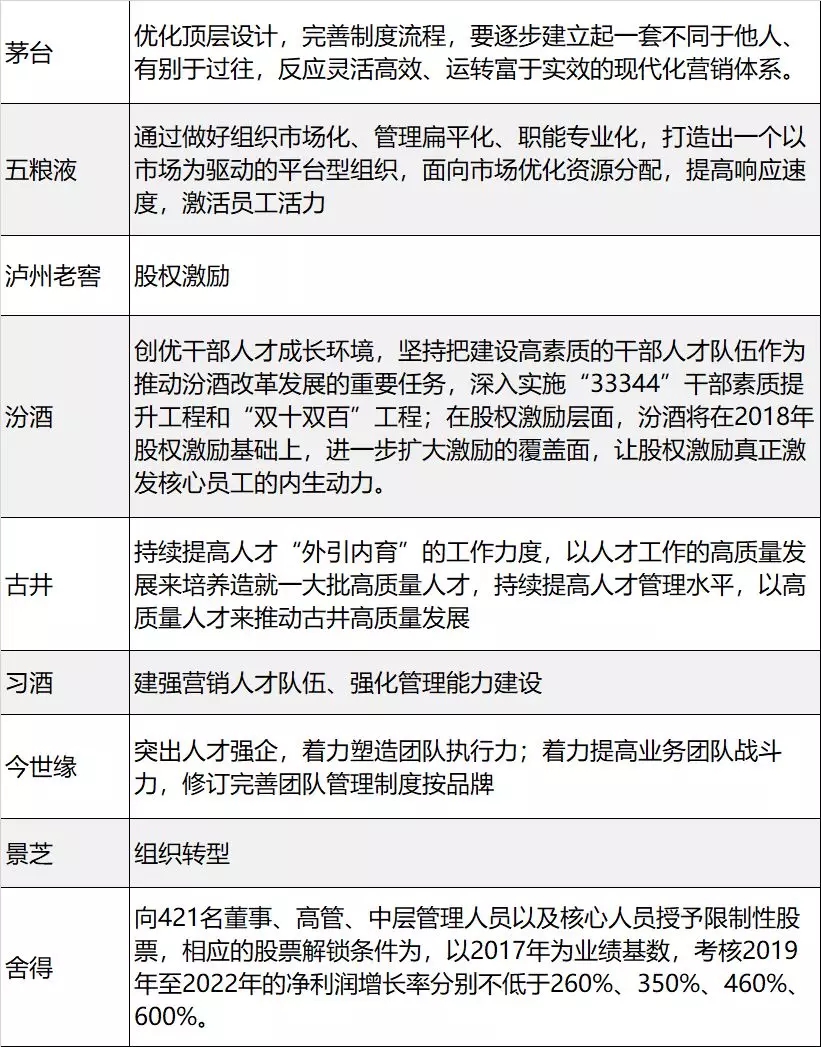 2019年,各大酒企都在加強團隊建設,培育人才,并以各種形式激勵管理層,以期吸引和留住優(yōu)秀人才,充分調動管理層與核心骨干的積極性。一言以概之:當企業(yè)利益和核心團隊利益結合在一起時,企業(yè)才能獲得長足的發(fā)展。