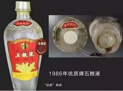 1985-1987年優質牌五糧液。頸標為中國名酒,商標位置改放了全國評酒會金獎燙金獎牌(“優質”獎章),商標兩側有“注冊商標”字樣,增掛合格證在頸部。