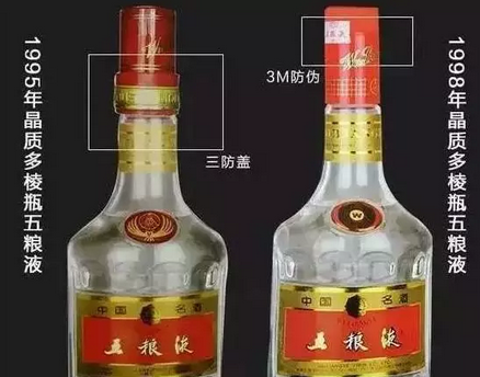 晶質多棱瓶一直是有頸標的,1995年至1998年封口技術主要采用塑蓋“三防蓋”,1998年到2004年期間采用3M防偽技術,2004年后至今,這兩個時期五糧液的真假鑒定方法包裝上都有詳細說明。而酒標上的變化,1998年,五糧液酒廠改造,組建五糧液集團,酒標上的生產單位正式標注為“宜賓五糧液股份有限公司”。