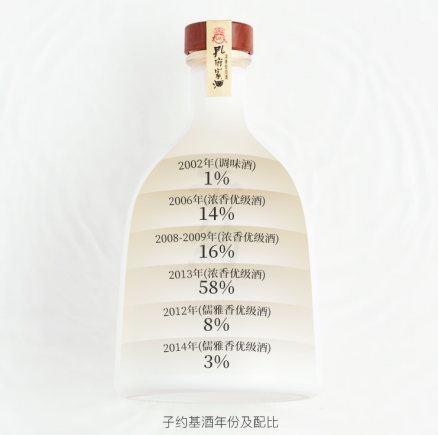 據孔府家酒CEO、子約品牌創始人劉濤介紹,子約·智篇是子約的文化版,酒體是以濃香年份老酒為基礎(2002年1%,2006年14%,2008-2009年16%,2013年58%),增調孔府家特有的儒雅香老酒(2012年8%,2014年3%),這其中11%的儒雅香是匯聚“濃清醬芝”四大香型釀造工藝之所長,酒體兼具“清香之爽凈”、“濃香之綿甜”、“醬香之優雅”及“芝麻香之舒適”,使子約·智篇擁有酒體醇厚、層次感強的獨特風味,香氣媲美智慧舍得的陳香,口感比肩無上妙品酒鬼的馥郁香,“滴滴純香”名副其實,更可謂“滴滴臻純香”。