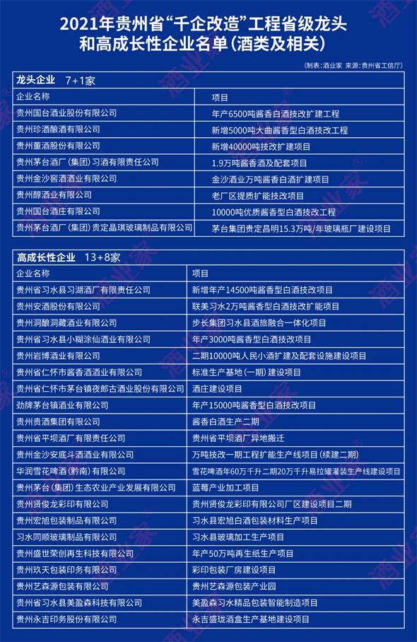 近日,貴州省工信廳發布的2021“千企改造”工程省級龍頭和高成長性企業名單中,多家黔酒榜上有名。