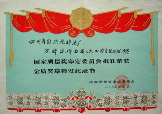 ▲沱牌所獲1989年國家名酒金質獎獎狀