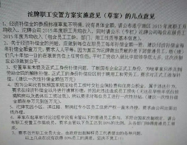 通過采訪,記者了解到,這10多名員工確實為此次員工安置事件的職工代表。據他們介紹,3月22日,射洪縣人民政府辦公室出臺了關于征求《四川沱牌舍得集團有限公司職工安置實施方案(草案)》意見的通知。