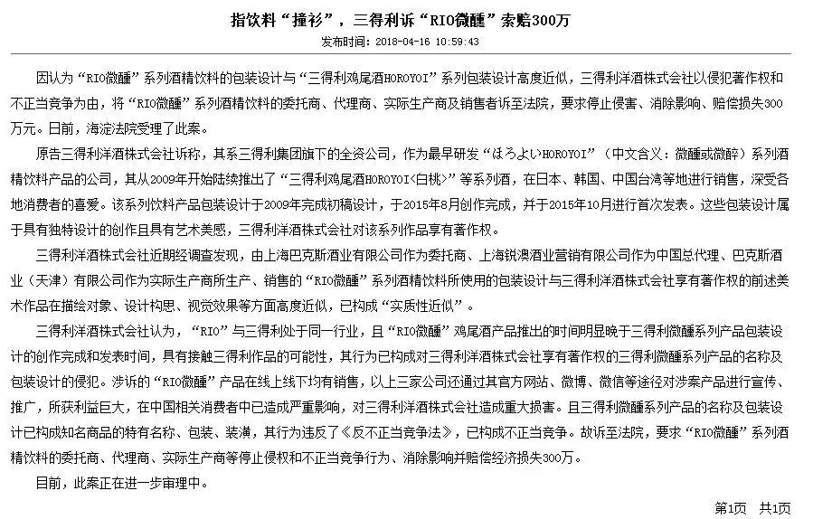 4月16日,北京市海淀法院網(wǎng)發(fā)布消息,稱因認為“RIO微醺”系列酒精飲料的包裝設計與“三得利雞尾酒HOROYOI”系列包裝設計高度近似,三得利洋酒株式會社以侵犯著作權和不正當競爭為由,將“RIO微醺”系列酒精飲料的相關當事人告上法庭,索賠300萬。