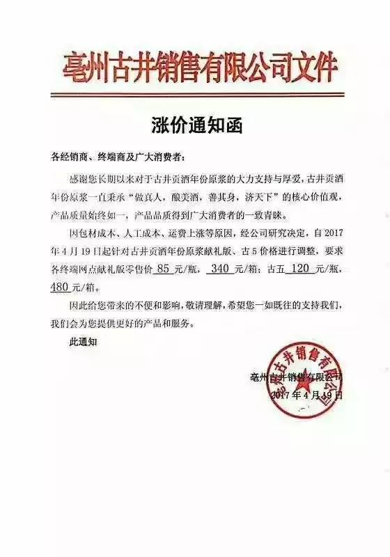 需要注意的是,這一次漲價的理由是包裝、人工、物流等方面的成本上漲,這一次漲的是產品的終端零售價,官方通知函中并沒有明確指出會提高產品的出廠價。也就是說,此次漲價對于手中有上述兩款產品的經銷商是有利的,因為在出廠價保持不變的情況下,提高零售價有利于增加經銷商利潤。這也許是古井貢廠家在傳統淡季時鼓勵、讓利經銷商的一種行為。