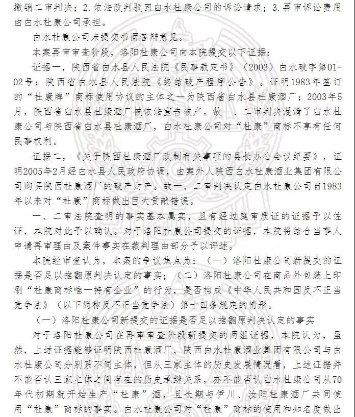 與此同時,白水杜康方面出具了一份最高法2018年3月16日簽發(fā)的《洛陽杜康控股有限公司、陜西白水杜康酒業(yè)有限責任公司商業(yè)詆毀糾紛再審審查與審判監(jiān)督民事裁定書》”。