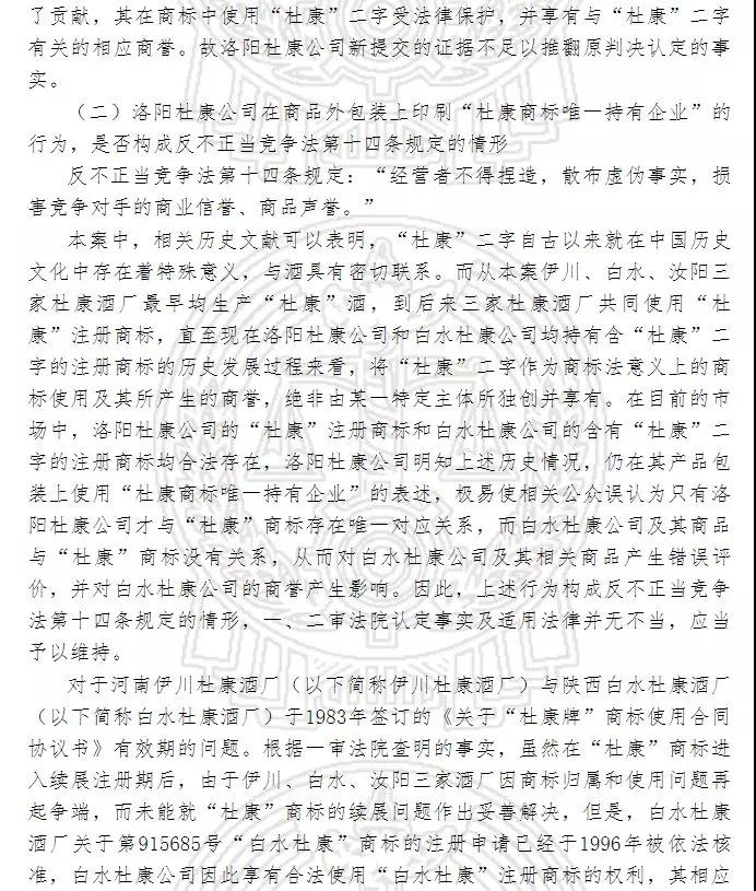 例如針對此前洛陽杜康在產(chǎn)品上標注“杜康商標唯一持有企業(yè)”的情況,最高法的裁定書明確指出:“洛陽杜康公司明知上述歷史情況(指尹川、汝陽、白水三家共用杜康商標),仍在其產(chǎn)品包裝上使用‘杜康商標唯一持有企業(yè)’的表述…構(gòu)成反不正當競爭法第14條規(guī)定的情形”。
