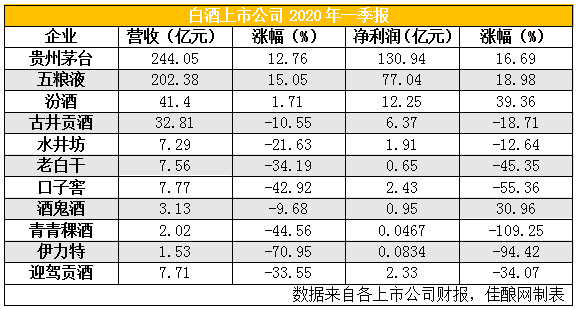 在目前已發布的11份2020年一季報中,僅茅臺、五糧液和汾酒實現了營收增長,其余8家酒企營收全部下滑。老白干、口子窖、青青稞酒、伊力特和迎駕貢酒的營收降幅均超過三成,其中伊力特降幅超過七成。