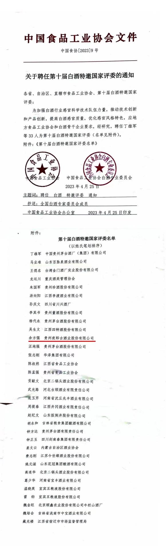 近日,由中國食品工業協會主辦的2023年第十屆白酒國家評委換屆考評工作圓滿結束,夜郎古酒業董事長余方強受聘成為“第十屆白酒特邀國家評委”。通知名單顯示,成為本屆 “白酒特邀國家評委”的人員包括茅臺集團黨委書記、董事長丁雄軍在內共計33人。