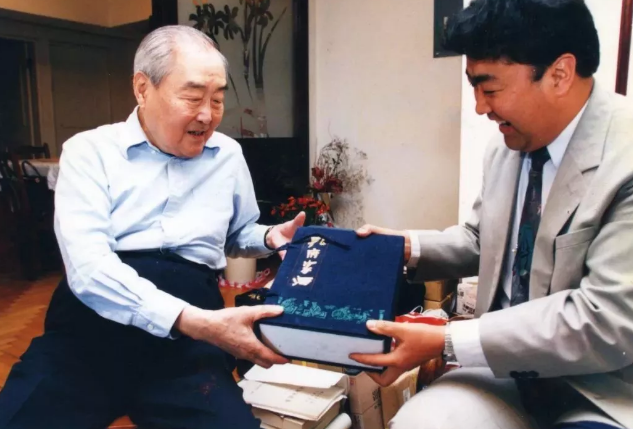 ▲1995年4月,原曲阜市文管會主任孔祥林向孔子第七十七代嫡長孫孔德成贈送孔府家酒。