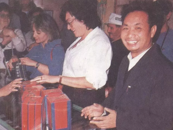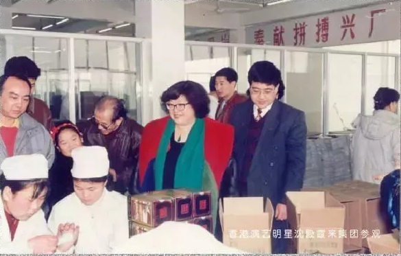 ▲香港演藝明星沈殿霞來曲阜酒廠參觀并品嘗孔府家酒。