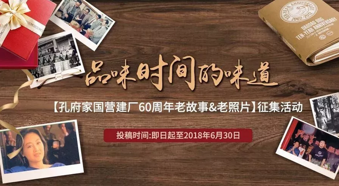 2018年,將迎來孔府家國營建廠60周年。為了共同分享大家的陪伴與喜悅,我們決定用一次溫情還帶精美獎品的方式,面向孔府家的所有粉絲征集“孔府家國營建廠60周年老故事&老照片”。