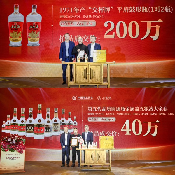 值得一提的是,在此次“家有老酒”活動現場,兩套極為罕見的陳年五糧液最終分別以40萬和200萬的價格成交,這印證了市場對陳年五糧液的認可和需求。據悉,兩套老酒均有中國酒業協會理事長宋書玉與五糧液集團(股份)公司黨委書記、董事長曾從欽的親筆簽名,其稀缺程度更上一層。