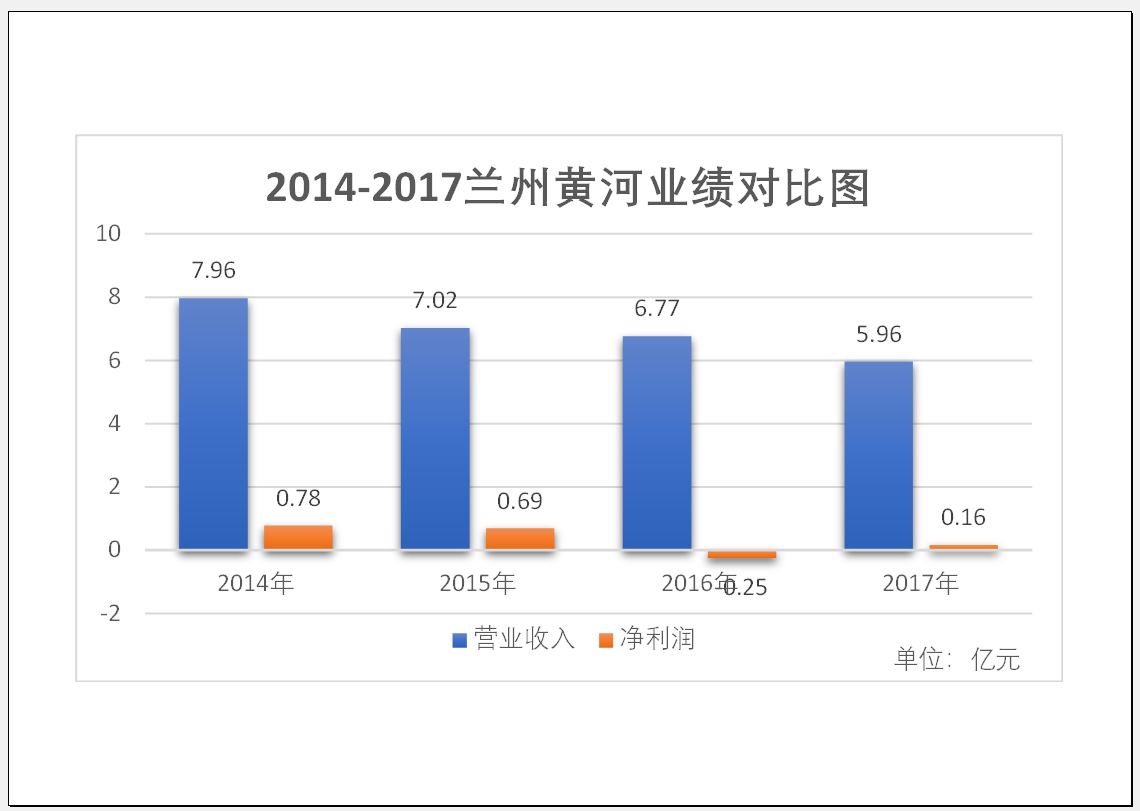 事實上,據(jù)財報數(shù)據(jù)顯示,從2014年至2017年,蘭州黃河分別實現(xiàn)營業(yè)收入7.96億、7.02億、6.77億和5.96億,同比分別下滑10.36%、11.79%、3.48%和12.01%。凈利潤分別為7790.23萬、6882.16萬、-2509.36萬、1623.6萬,同比增長分別為207.23%、-11.66%、-136.46%、135.3%。