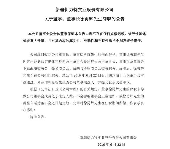 6月22日晚間,新疆伊力特實業股份有限公司董事會發布公告稱,公司近日收到公司董事長、董事徐勇輝先生的書面辭呈。