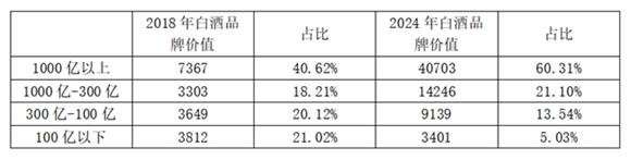 白酒內(nèi)部同樣呈現(xiàn)馬太效應(yīng)。腰腿部的300億-100億元(本文品牌價(jià)值皆為人民幣億元,下同)、100億以下區(qū)間白酒,相比2018年占比明顯下降,1000億-300億次高端白酒,占比微弱提升。提升最大的是頭部白酒,占比從40%提升至60.31%!