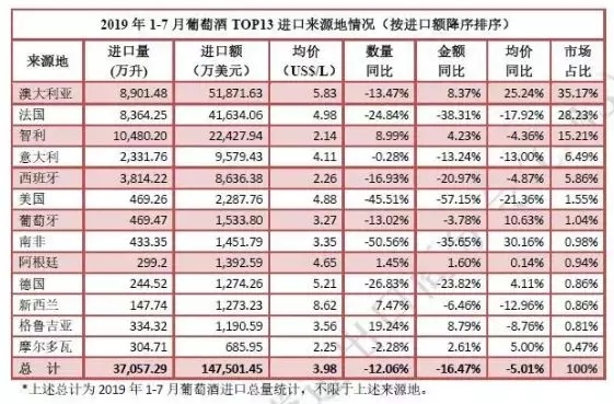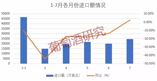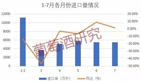 9月25日,中國食品土畜商會酒類進出口商分會公布了2019年1-7月份酒類進口酒數據,數據顯示,1-7月份,葡萄酒總計進口量3.7億升,同比下降12.06%,進口額總計14.8億美元,同比下降16.47%。