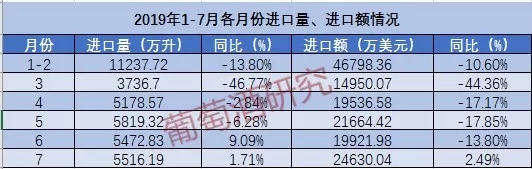 從上圖可以看出,2019年1-7月份,進口量總體穩定,1-5月呈現下降態勢,6、7月實現止跌回升,從7月份數據來看,進口量較6月份有小幅增長。進口額方面,1-6月進口額整體也是呈現下降態勢,而7月份實現了個位數增長。總體來看,7月份,進口量和進口額均實現小幅增長,這也是2019年單月首次實現量額雙升。有分析指出,這主要是受下半年預期旺季的影響,進口商加大了進貨量。