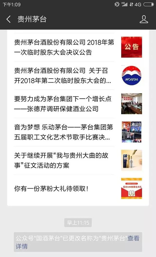日前,茅臺的微信公眾號“國酒茅臺”悄然更名為“貴州茅臺”。根據系統信息顯示,該賬號主體法人為貴州茅臺酒股份有限公司。隨后澎湃君打開茅臺酒股份有限公司網站,上面也沒有了“國酒”字樣。