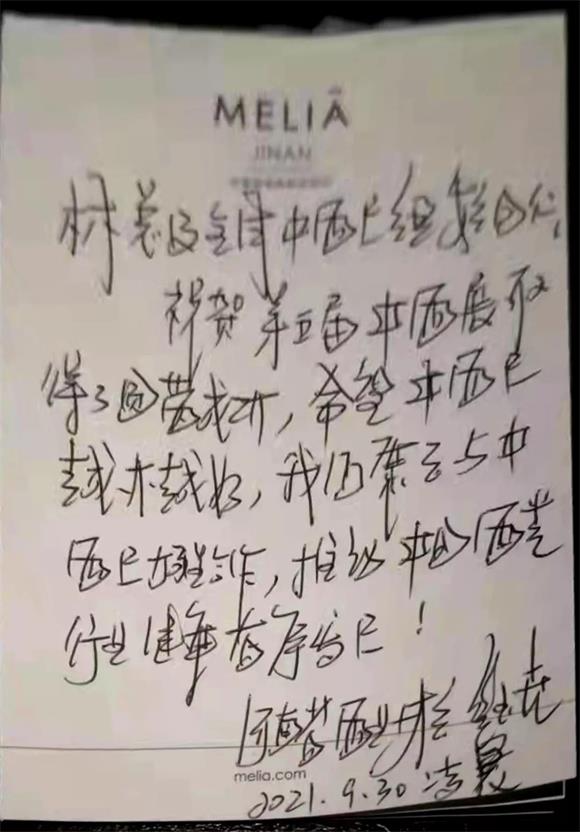 9月27日下午,中國酒類流通協會副會長、河南省酒業協會會長熊玉亮在第十一屆中國酒業市場論壇上的嘉賓致辭中對中酒展表達了高度贊揚:“中國高端白酒展覽會已經成功舉辦了四屆,通過這個平臺,酒商和酒類零售等各個鏈條之間進行了充分的溝通交流,有力地破除了信息壁壘,實現了高效對接。”會后更是親筆寫下寄語,祝福中酒展越來越好。