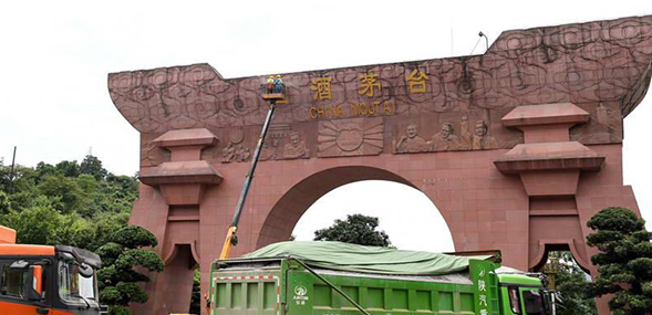 6月29日,貴州省仁懷市茅臺鎮,工人拆除了貴州茅臺酒廠廠大門上的“國酒”字樣。