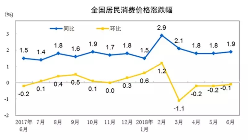 7月10日, 國家統計局今天發布的2018年6月份全國居民消費價格指數(CPI)數據顯示,CPI環比下降0.1%,同比上漲1.9%,同比漲幅比上月略微擴大0.1個百分點。上半年,全國居民消費價格比去年同期上漲2.0%。