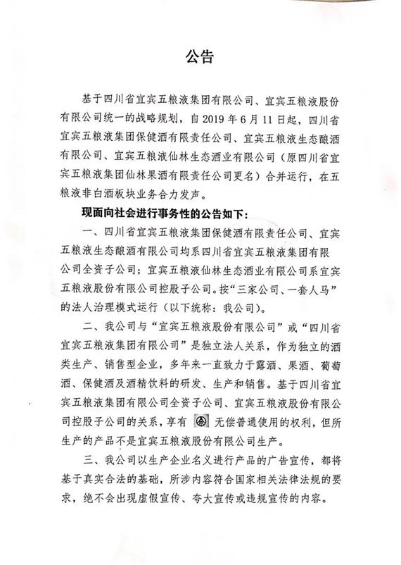 7月15日下午,快訊君獲悉,宜賓五糧液集團保健酒有限責任公司、宜賓五糧液生態釀酒有限公司、宜賓五糧液仙林生態酒業有限公司聯合發布《公告》,公告顯示,基于四川省宜賓五糧液集團有限公司、宜賓五糧液股份有限公司統一戰略,自2019年6月11日起,三家公司合并運行,在五糧液非白酒板塊業務合力發聲。公告內容如下文: