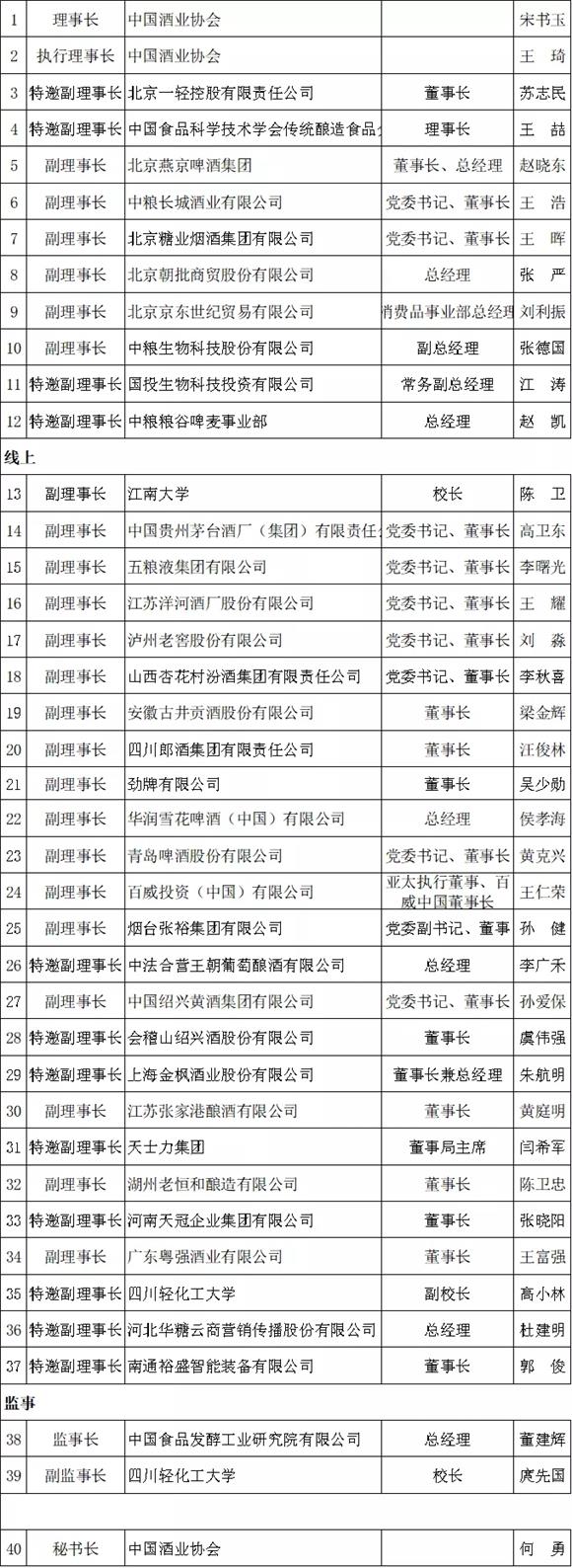 會議上,經無記名投票選舉,第五屆中國酒業協會副理事長兼秘書長宋書玉當選中酒協第六屆理事會理事長,同時第六屆理事會理事、常務理事、秘書長、副理事長,以及監事會監事、副監事長、監事長等也經投票選舉落定。同時,會上宣布聘任王延才為中國酒業協會第六屆理事會名譽理事長。
