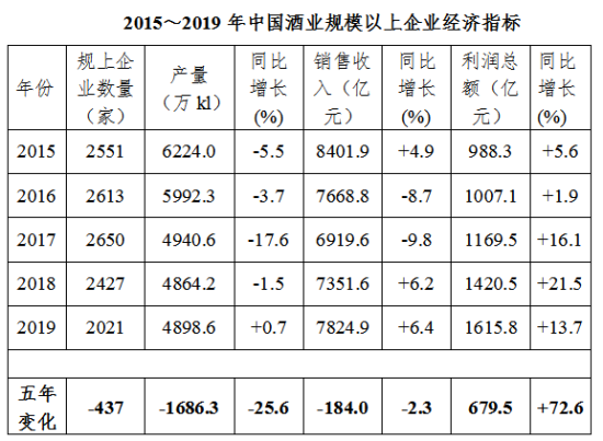 對于中國釀酒行業過去五年的發展,王延才在《中國酒業協會第五屆理事會工作報告》中表示,如果說2012年—2014年的深度調整主要是解決產業發展不平衡不充分問題,那么2015年—2019年便是產業主動適應新常態,提質增效,推進高質量發展,實現大繁榮大發展的五年,主要呈現出四大變化: