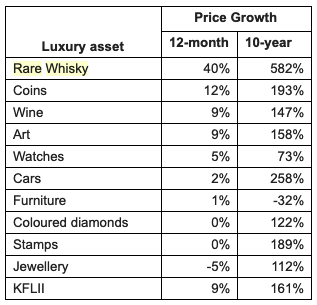 最近由英國 Knight Frank 奢侈品投資指數顯示,在過去一年中稀有威士忌的投資漲幅高達 40%。其中 Rare Whisky 101 監控到英國拍賣行在100支珍稀威士忌在10年中的漲幅達到了驚人的582%。