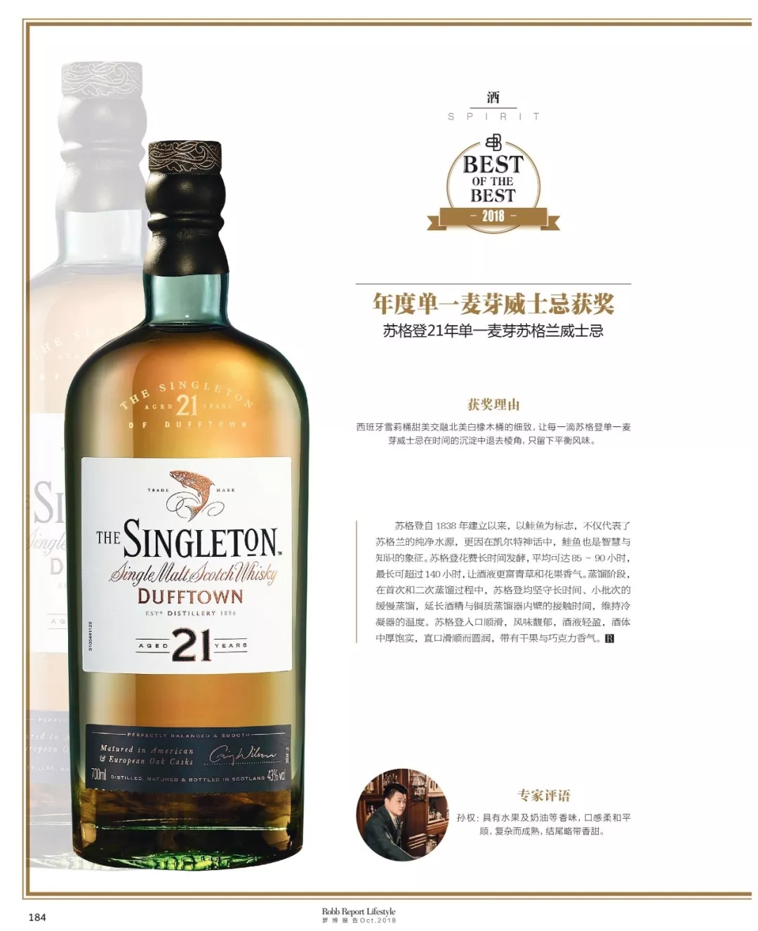其代表作之一蘇格登21年單一麥芽威士忌早已成為經典。這款產品采用高比例的雪莉桶風味,重新詮釋專屬于雪莉桶的豐郁果香,馥郁干果、烤橙皮與焦糖氣息漸次涌現,相互點綴,以果香與肉桂咖啡交織而成的悠長尾韻典雅收尾,醇順氣質是一款相當討喜。