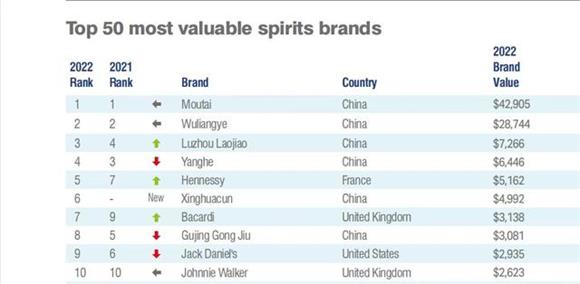 此前,由英國品牌評估機構“品牌金融”發布“2022全球酒類品牌價值榜”。中國的茅臺在烈酒品牌榜上名列第一,品牌價值為429億美元。這是茅臺自2016年開始,連續第7次登頂全球最具價值烈酒品牌50強。
