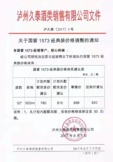 8月7日,國窖1573專營公司成都子公司瀘州久泰酒類銷售有限公司向各經銷客戶、核心終端下發《關于國窖1573經典裝價格調整的通知》,對國窖1573經典裝的計劃內配額供貨價、計劃外配額供貨價以及零售價、團購價進行了最新規定。