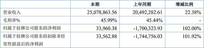 8月10日,金易久大(832965)發布半年度報告。半年報顯示,金易久大上半年實現營收2507.89萬元,較同期增加22.38%;歸屬于掛牌公司股東的凈利潤為3.40萬元,較同期增加102.00%。