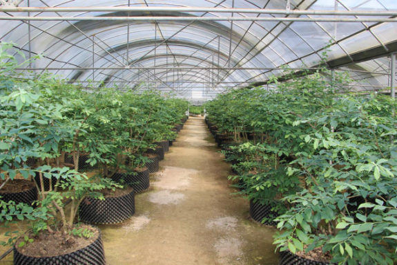 自2015年茅臺生態農業公司扎根丹寨開始,就確定了以藍莓種植和加工為突破口的,逐步涉足生態農業產業的發展戰略。丹寨雖然是藍莓的故鄉,具備藍莓生長的獨特優勢,但藍莓規模化種植需要大量集中連片的土地,而通過土地流轉方式獲得的土地卻參差不一,地勢陡峭、土壤貧瘠,大多數不能滿足藍莓生長的需要,基于現實的考量,勢必要對栽培方式和土壤地勢進行改良。經過長時間的研究,公司科研人員發現通過缽栽的方式種植藍莓,不僅可以增加藍莓基質的透氣性和排水性,還可以更加靈活地進行取土、配基質、修剪、采摘及苗木的轉運等農事活動,大大方便藍莓的生產和管理。通過對團粒結構、有機質、礦物離子等土壤質量改良,藍莓的存活率達到99%,提高了近30%。缽栽技術的創新突破了地形地勢對于藍莓種植的局限,土壤改良技術大大提高了藍莓的存活力和規避風險能力,為山區丘陵地帶發展大規模農業種植提供了參考。