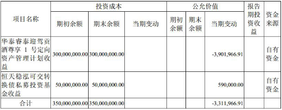 中國經(jīng)濟(jì)網(wǎng)記者查看半年報(bào)中上半年迎駕貢酒的投資成績單,發(fā)現(xiàn),上半年,公司3億元投資華泰睿泰迎駕貢酒尊享 1 號定向資產(chǎn)管理計(jì)劃收益,這一投資公允價(jià)值減少了390萬;迎駕貢酒5000萬元投的恒天穩(wěn)泓可交轉(zhuǎn)換債私募投資基金收益公允價(jià)值增加了59萬。兩項(xiàng)3.5億元的投資合計(jì)公允價(jià)值減少了331萬元。