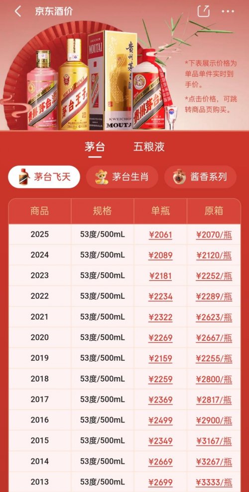 盡管白酒市場整體進入傳統淡季,市場上出現飛天茅臺價格波動的聲音,但通過上述市場調研顯示,情況并非表面看起來那么簡單。飛天茅臺在核心消費群體中依然供不應求,價格保持穩健。根據8月30日京東酒價數據顯示,2025年的53%/500ml的飛天茅臺單瓶售價為2061元,整箱價格為2070元,均保持在2000元以上。市場表現與京東平臺上的整體行情基本吻合,也印證了市場需求依舊旺盛、供需格局緊平衡的現狀。