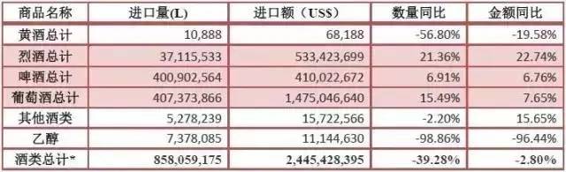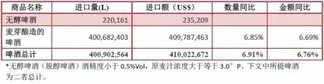 啤酒方面,報告期內進口啤酒量額小幅上行,進口總量為4.0億升,同比增長6.9%,進口額4.1億美元,同比增長6.8%。