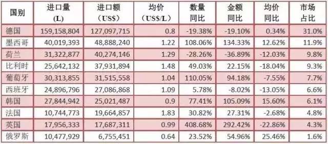 從來源地方面看,進口啤酒市場中,德國位居第一,墨西哥與荷蘭相差較小。德國與荷蘭量額均有不小跌幅,墨西哥維持強勢增長。其他進口來源地方面,葡萄牙之前增速較此前有所放緩,而英國高增長的態勢仍在繼續。